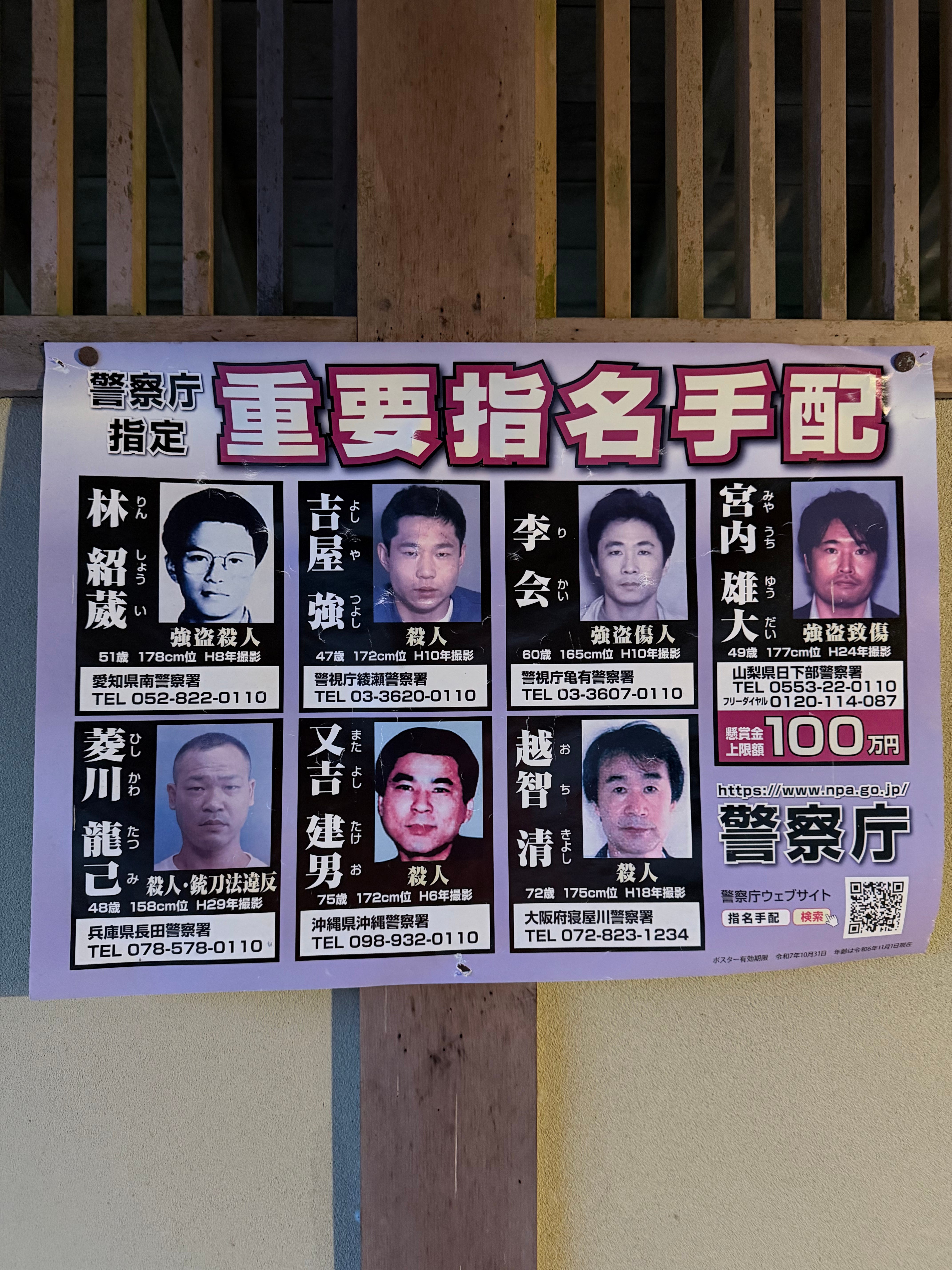 Around minute fifty, I was up and pacing, fingertips cold. I noticed the frisbee-golf map was indecipherable, Japanese-only. And there was a covered rest stop nearby, similar to a bus stop, where a faded wanted poster showed seven criminals, but it was also Japanese-only, and I couldn’t read about their crimes. A friend who reads Japanese confirmed this for me later, he said the poster’s probably been there for twenty years, unfortunately I forget in the moment to ask him what the men did.